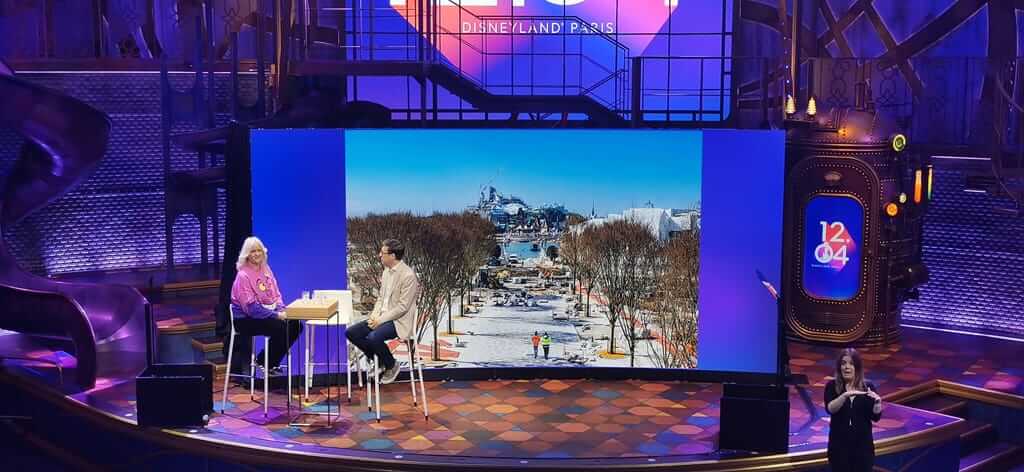 Notre journée a débuté à 9h15, au Studio D des Walt Disney Studios, où nous avons été chaleureusement accueillis. Étaient présents Natacha Rafalski, présidente de Disneyland Paris, les ambassadeurs, ainsi que plusieurs représentants de Walt Disney Imagineering, du portfolio et d’autres services impliqués dans les projets en cours à Disneyland Paris, en particulier au sein du parc Walt Disney Studios, qui deviendra – pour rappel – Disney Adventure World en 2026, à l’occasion de l’ouverture de World of Frozen.