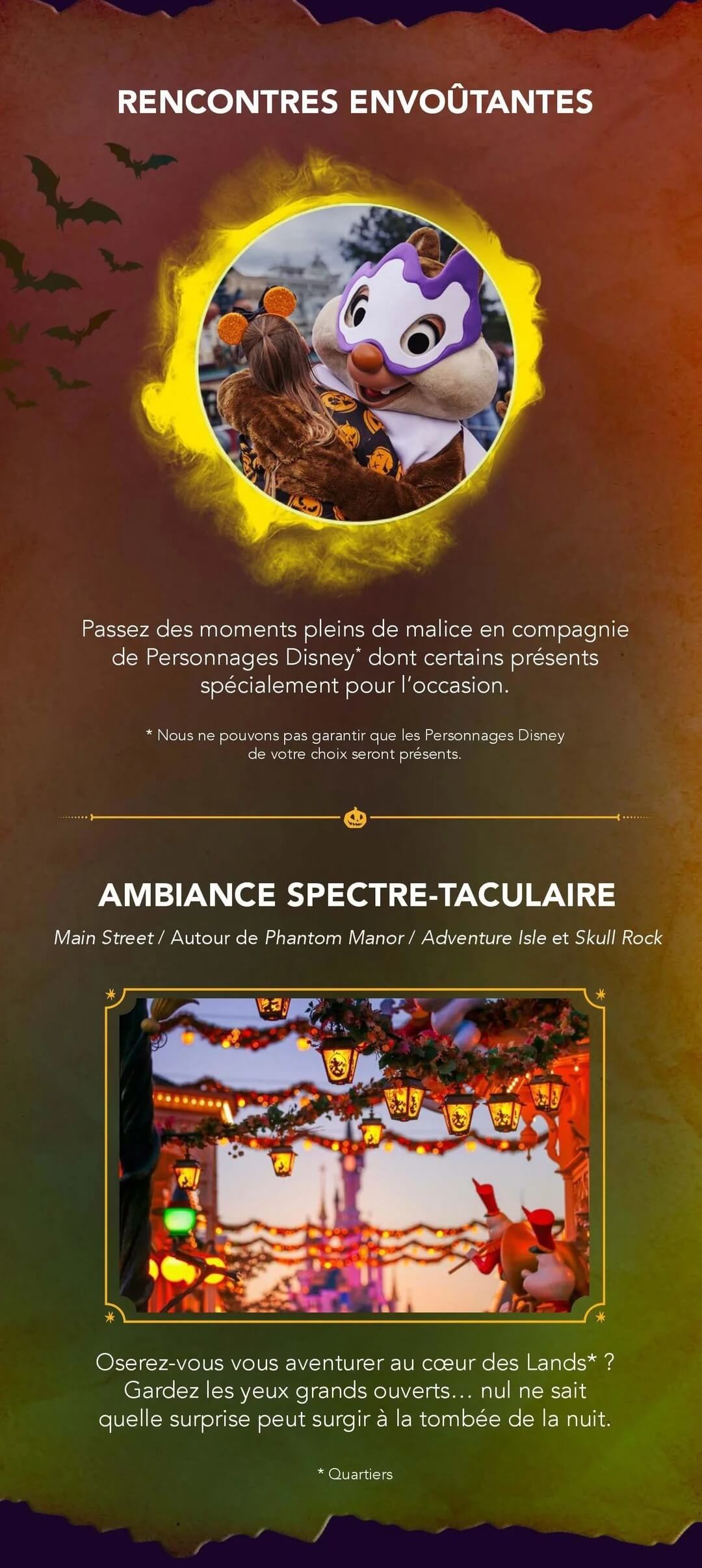 Le Parc Disneyland se métamorphose totalement : citrouilles rieuses, guirlandes orangées, silhouettes fantomatiques et détails malicieux décorent chaque recoin.