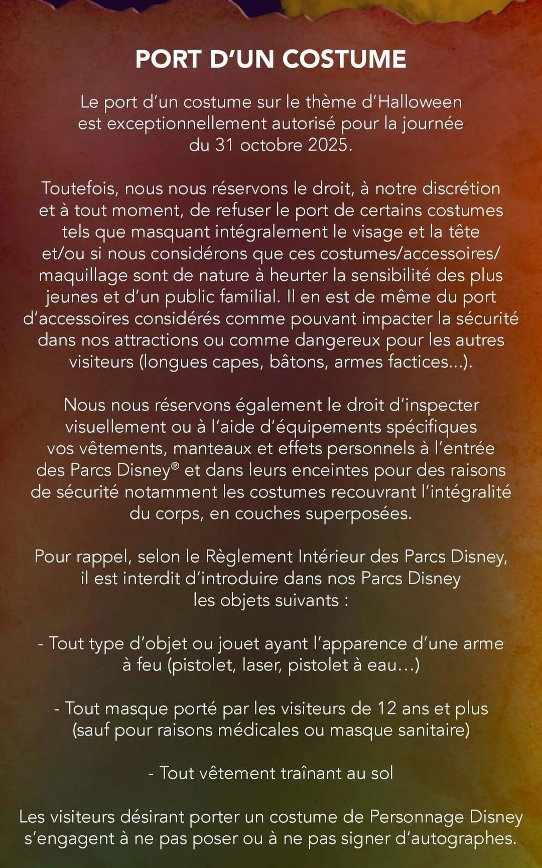Le 31 octobre, les visiteurs sont invités à venir costumés pour célébrer Halloween… mais certaines règles s’imposent pour garantir la sécurité et la magie de tous.