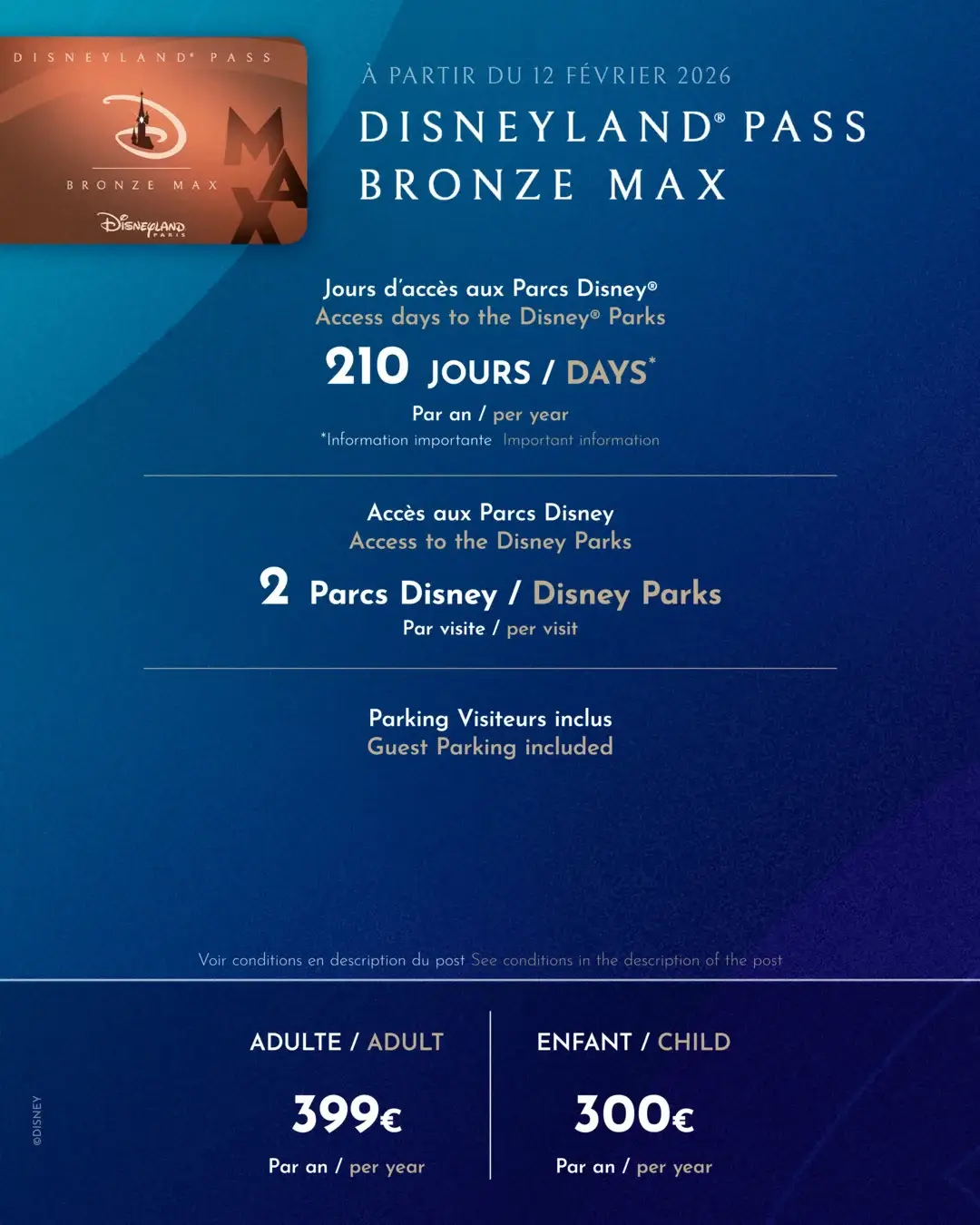 | Bronze Max | — | 399 € – 210 j – Réservation obligatoire – 2 Parcs – pas de réduction | +110 € pour retrouver 2 Parcs |