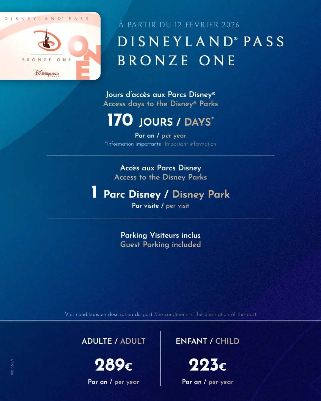 | Bronze → Bronze One | 289 € – 170 j – 2 Parcs | 289 € – 170 j – Réservation obligatoire – 1 Parc par jour | Régression majeure |