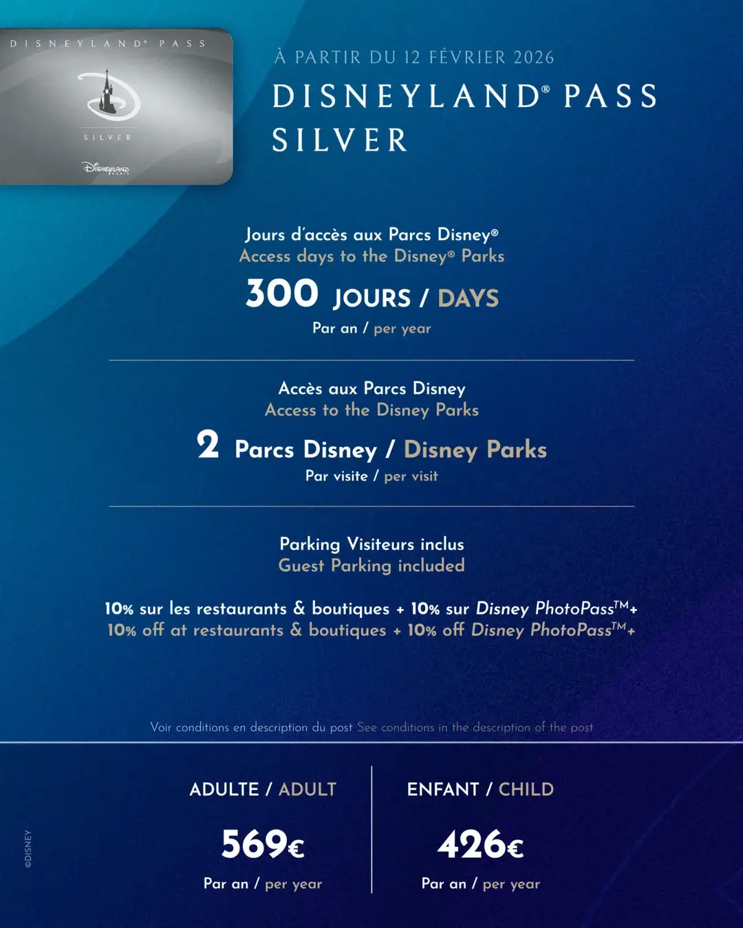 | Silver | 499 € – 300 j – 2 Parcs –10 % | 569 € – 300 j – Réservation obligatoire – 2 Parcs –10 % ✔ réduction valable même en jours de restriction |