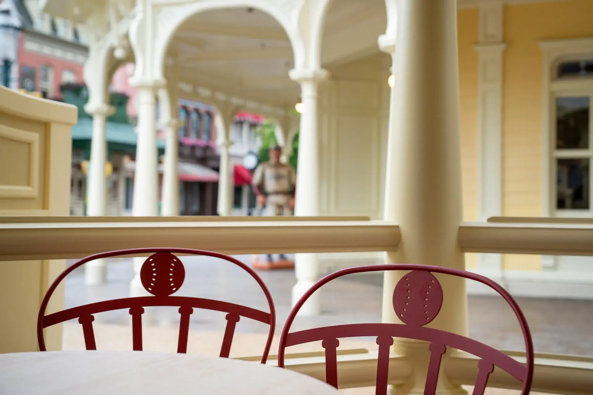 Dès le premier regard, j’ai adoré cette terrasse élégante et abritée, parfaite pour savourer un hot-dog à l’ombre tout en profitant de l’ambiance unique de Main Street. Fidèle à l’esprit victorien qui caractérise la zone, la structure mêle plusieurs toits, de jolies frises à bouliers, et de magnifiques lampes en globes de verre sablé avec des finitions en laiton. Mais le vrai charme se cache dans les détails… et ces détails, ils parlent aux fans de baseball.